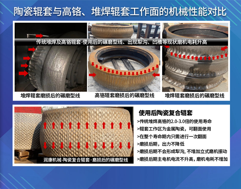 陶瓷復(fù)合輥套使用壽命長(zhǎng),備件磨損小,不會(huì)導(dǎo)致磨機(jī)時(shí)常出力不夠,備件磨損較大、臺(tái)時(shí)產(chǎn)量低、需要停機(jī)、檢修、拆卸、配件更換、產(chǎn)品交貨拖期、人工等費(fèi)用,從而為企業(yè)大大降低年運(yùn)營(yíng)成本30%。