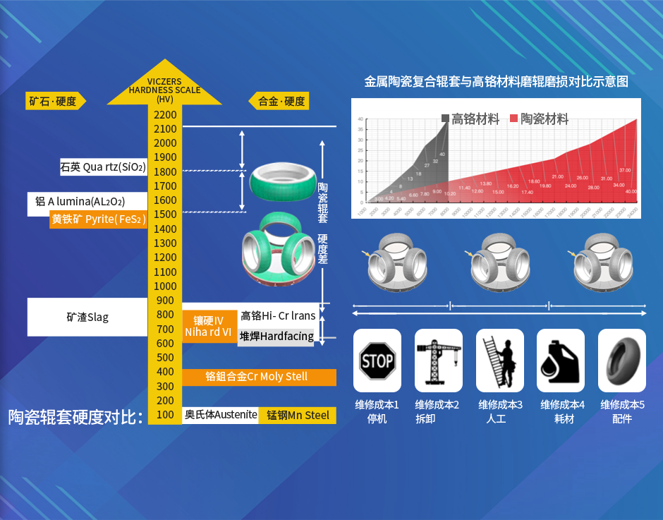傳統(tǒng)堆焊/高鉻輥套HV硬度普遍約為650,而陶瓷合金HV硬度可達(dá)1850-2100,新材料帶來(lái)傳統(tǒng)材料的2.0-3.0倍的使用壽命.更長(zhǎng)的單次使用周期,為企業(yè)減少停機(jī)、拆卸、人工、耗材、配件等維護(hù)成本。